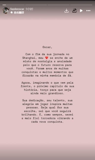 12月20日訊 奧斯卡的國(guó)外球迷團(tuán)體在社媒發(fā)告別信,稱奧斯卡在中國(guó)的旅途即將結(jié)束。